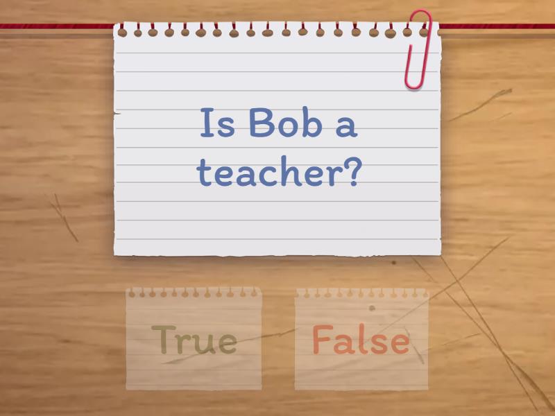 True: Is Bob a teacher?, Are they from the USA?, Am I tired?, Are Linda and Kate friends?, Is she tall?, Are my parents students?, False: Are he short?, Is we classmates?, Am Bill ten years old?, Is Mila and Ron in the park?, Are grandma tired?, Am it cold outside?,