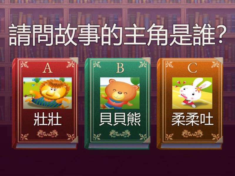 1) 請問故事的主角是誰? a) 壯壯 b) 貝貝熊 c) 柔柔吐 2) 壯壯急急忙忙地到學校,發生了什麼事? a) 撞到老師 b) 撞到貝貝熊 c) 跌倒 3) 壯壯在玩躲避球時發生什麼事情? a) 丟球太用力了,讓同學接不到球。 b) 一直被球打到 4) 壯壯遇到問題時,最常說哪句話? a) 對不起,我錯了 b) 都是你的錯! 5) 壯壯在遇到哪件事情後,覺得自己很委屈? a) 被暴暴龍撞到 b) 被媽媽罵 c) 考試考0分 6) 這個故事要告訴我們什麼? a) 做錯事時,要能自我省思 b) 做錯事都是別人的錯