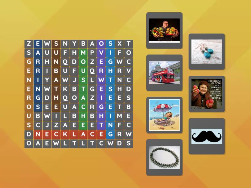 moustache, overweight, necklace, sightseeing, sunbathe, earrings, generous,