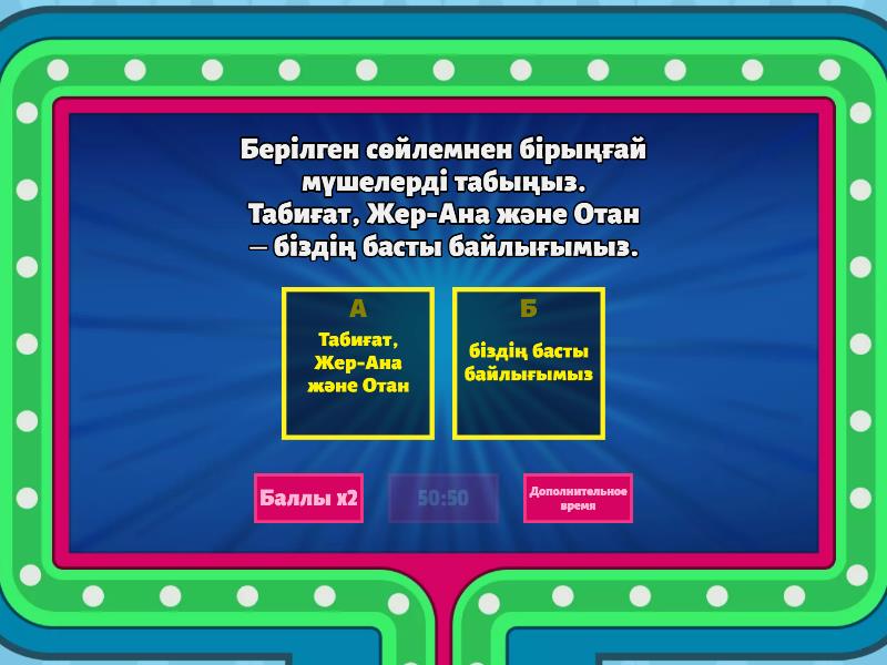 1) Берілген сөйлемнен бірыңғай мүшелерді табыңыз. Табиғат, Жер-Ана және Отан – біздің басты байлығымыз. a) Табиғат, Жер-Ана және Отан b) біздің басты байлығымыз 2) Сөйлемнің бірыңғай мүшелері a) Сөйлем құрауға қатысқан толық мағыналы сөздер b) Сөйлемдегі қызметі, тұлғасы бірдей,бір сұраққа жауап беретін , бір ғана мұшемен байланысатын екі не одан да көп мүшелерді 3) Бірыңғай мүшелер сөйлемнің қай мүшесі болып тұр? Анасы дүкеннен нан, май, қант және шай сатып алды. a) толықтауыш b) бастауыш 4) Бірыңғай мүшелердің арасында қандай тыныс белгісі қойылады? Кітап, дәптер, қалам – бәрі үстел үстінде. a) Сызықша b) Үтір 5) Сөйлемдегі бірыңғай мүшелерді анықтаңыз: Балалар гүлдер мен ағаштарды суарды. a) Балалар суарды b) гүлдер мен ағаштарды 6) Бірыңғай мүше ... сұраққа жауап береді? a) бір ғана b) бірнеше 7) Бірыңғай мүшелер сөйлемнің қай мүшесі болып тұр? Мен бұл жерден тыныштықты, әдемілікті және жайлылықты таптым. a) Анықтауыш b) Толықтауыш 8) Бірыңғай мүшелер өзара жалғаулықсыз байланысса a) арасына үтір қойылады b) арасына сызықша қойылады 9) Жалғаулық шылаулар бірыңғай мүшелердің арасында қайталанып келсе a) арасына үтір қойылмайды b) арасына үтір қойылады 10) Бірыңғай мүшелердің арасында мен, және, пен,бен жалғаулықтары бір-ақ рет келсе a) арасына үтір қойылмайды b) арасына үтір қойылады