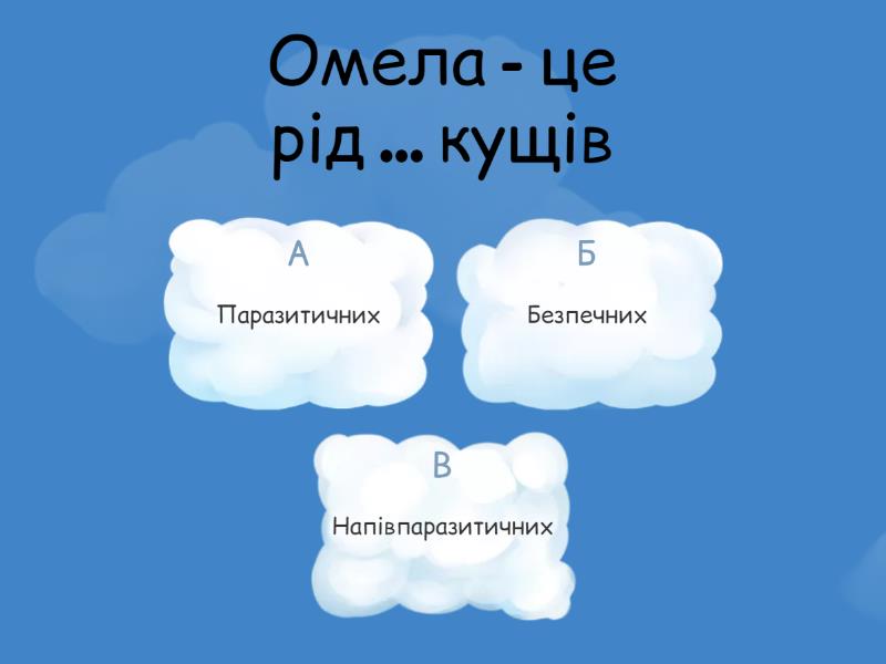 1) Омела - це рід ... кущів a) Паразитичних b) Безпечних c) Напівпаразитичних 2) Омела, це який тип живлення? a) Гетеротрофний b) Автотрофний c) Міксотрофний 3) Омела безпечна для людини? a) Так b) Ні 4) Це правда, що Омела лікує? a) Ні b) Так