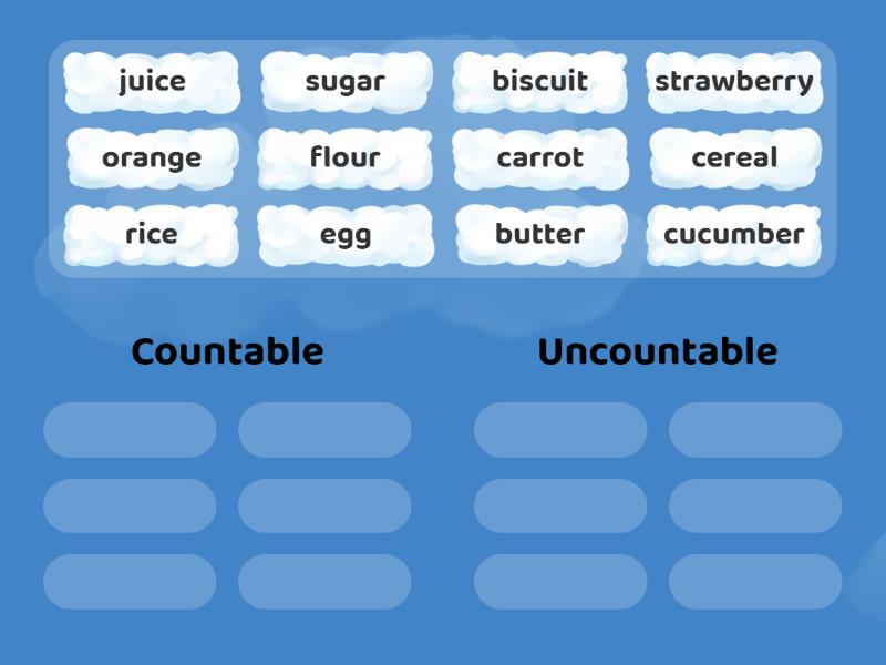 Countable: carrot, biscuit, egg, orange, cucumber, strawberry, Uncountable: juice, butter, sugar, rice, cereal, flour,