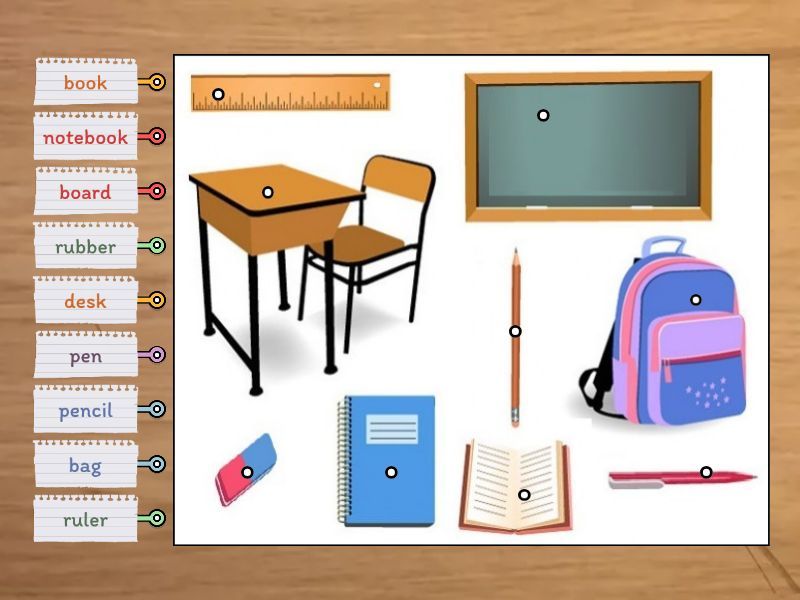 ruler, board, desk, pencil, pen, rubber, notebook, book, bag.