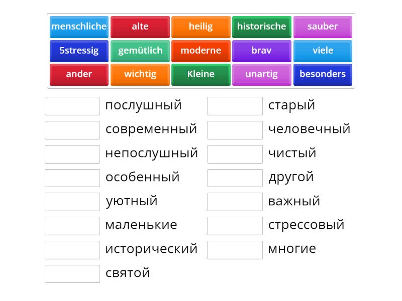 Kleine - маленькие, heilig - святой, historische - исторический, menschliche - человечный, moderne - современный, besonders - особенный, ander - другой, wichtig - важный, gemütlich - уютный, 5stressig - стрессовый, unartig - непослушный, brav - послушный, sauber - чистый, viele - многие, alte - старый ,