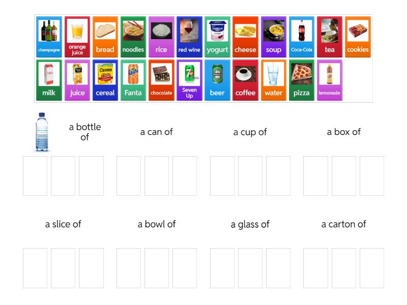 a bottle of: Coca-Cola, lemonade, champagne, a can of: Seven Up, Fanta, beer, a cup of: tea, coffee, a box of: chocolate, cereal, cookies, a slice of: bread, pizza, cheese, a bowl of : rice, noodles, soup, a glass of: water, orange juice, red wine, a carton of: milk, yogurt, juice,