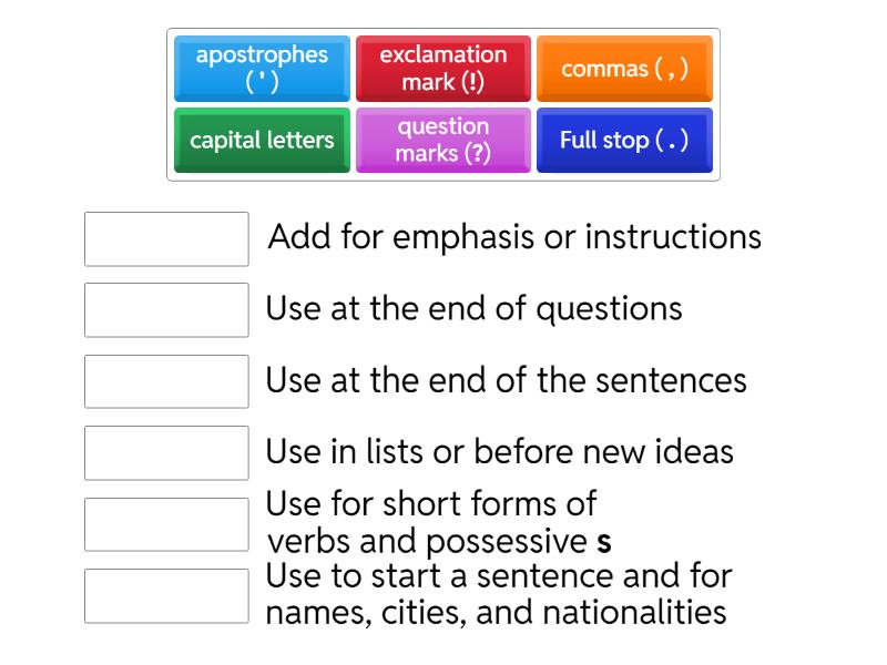 Full stop ( . ) - Use at the end of the sentences, capital letters - Use to start a sentence and for names, cities, and nationalities, commas ( , ) - Use in lists or before new ideas, apostrophes ( ' ) - Use for short forms of verbs and possessive s, question marks (?) - Use at the end of questions, exclamation mark (!) - Add for emphasis or instructions,