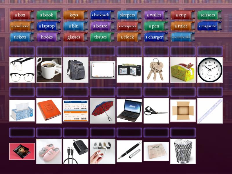a box, a book, a pen, a clock, a cup, scissors, keys, a newspaper, a backpack, a laptop, an umbrella, a wallet, glasses, a board, a pencil case, hooks, a bin, tissues, tickets, sleepers, a charger, a magazine, a ruler,
