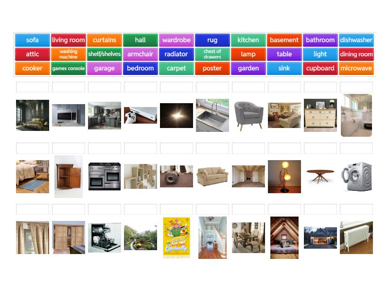 attic, living room, bedroom, garage, bathroom, dining room, basement, hall, kitchen, garden, chest of drawers, curtains, dishwasher, microwave, rug, wardrobe, cupboard, carpet, cooker, games console, sink, radiator, shelf/shelves, light, armchair, washing machine, lamp, sofa, table, poster,