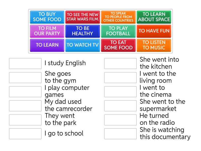 TO SEE THE NEW STAR WARS FILM. - I went to the cinema, TO LEARN - I go to school, TO LISTEN TO MUSIC - He turned on the radio, TO BUY SOME FOOD - She went to the supermarket, TO BE HEALTHY - She goes to the gym, TO HAVE FUN - I play computer games, TO SPEAK TO PEOPLE FROM OTHER COUNTRIES - I study English, TO EAT SOME FOOD - She went into the kitchen, TO WATCH TV - I went to the living room, TO LEARN ABOUT SPACE - She is watching this documentary, TO PLAY FOOTBALL - They went to the park, TO FILM OUR PARTY - My dad used the camrecorder,