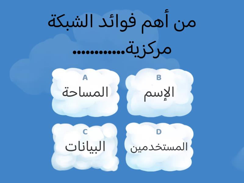 1) من أهم فوائد الشبكة مركزية............ a) المساحة b) الإسم c) البيانات d) المستخدمين 2) الشبكة المحلية هي شبكة محدودة في........... a) المساحة b) الإسم c) البيانات d) المستخدمين 3) مشاركة.............هي عملية نشر معلومات مخزنة رقمياً. a) البحث b) المستخدمين c) الملفات d) المكونات المادية 4) يمكن البحث عن الجهاز المطلوب الوصول اليه داخل الشبكة عن طريق........ a) المساحة b) الإسم c) البيانات d) المستخدمين 5) يمكن..........الوصول الي ملفاتك التي قمت بمشاركتها عن طريق الوصول لمجلد Public الخاص بك. a) البحث b) المستخدمين c) الملفات d) المكونات المادية 6) نكتب المصطلح Sharing في خانة........للوصول إلى الأيقونة Sharing a) البحث b) المستخدمين c) الملفات d) المكونات المادية