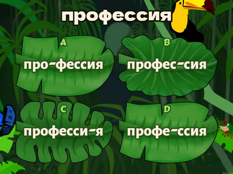 1) профессия a) про-фессия b) профес-сия c) професси-я d) профе-ссия 2) ящерица a) я-щерица b) яще-рица c) ящери-ца d) ящ-ерица 3) огромные a) ог-ромные b) о-громные c) огром-ные d) огромны-е 4) вьюга a) вь-юга b) вью-га c) вьюг-а 5) съезд a) съезд b) съ-езд c) съе-зд 6) троллейбус a) тро-ллейбус b) трол-лейбус c) тролле-йбус d) троллей-бус 7) армия a) ар-мия b) а-рмия c) арми-я d) арм-ия 8) альбом a) аль-бом b) ал-ьбом c) а-льбом 9) молоко a) м-олоко b) мол-око c) мо-локо 10) печенье a) пе-ченье b) пече -нье c) печень-е 11) ручник a) руч-ник b) ру-чник c) ручн-ик 12) школа a) школ-а b) шк-ола c) шко-ла 13) двойка a) дво-йка b) дв-ойка c) двойк-а d) двой-ка 14) ёлка a) ё-лка b) ёл-ка c) ёлк-а 15) блокнот a) блок-нот b) блокно-т c) бло-кнот d) бл-окнот 16) раскраска a) рас-краска b) раскрас-ка c) ра-скраска d) раск-раска 17) собака a) соб-ака b) собак-а c) со-бака d) соба-ка 18) напиток a) нап-иток b) на-питок c) напито-к d) напи-ток 19) семья a) се-мья b) семь-я c) с-емья d) сем-ья 20) колобок a) кол-обок b) ко-лобок c) колоб-ок d) коло-бок 21) учительница a) у-чительница b) учительни-ца c) учитель-ница d) учител-ьница 22) осенний a) осен-ний b) осенн-ий c) о-сенний d) осенни-й 23) кипяток a) кип-яток b) кипя-ток c) кипят-ок d) ки-пяток 24) задание a) з-адание b) за-дание c) зад-ание d) зада-ние