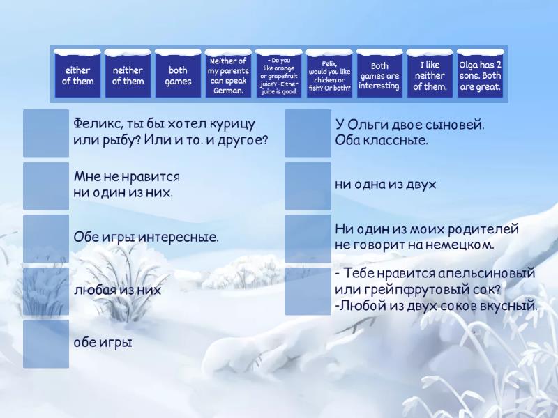 Both games are interesting. - Обе игры интересные., - Do you like orange or grapefruit juice? -Either juice is good. - - Тебе нравится апельсиновый или грейпфрутовый сок? -Любой из двух соков вкусный., I like neither of them. - Мне не нравится ни один из них., Neither of my parents can speak German. - Ни один из моих родителей не говорит на немецком., Olga has 2 sons. Both are great. - У Ольги двое сыновей. Оба классные., Felix, would you like chicken or fish? Or both? - Феликс, ты бы хотел курицу или рыбу? Или и то. и другое?, both games - обе игры, neither of them - ни одна из двух, either of them - любая из них,