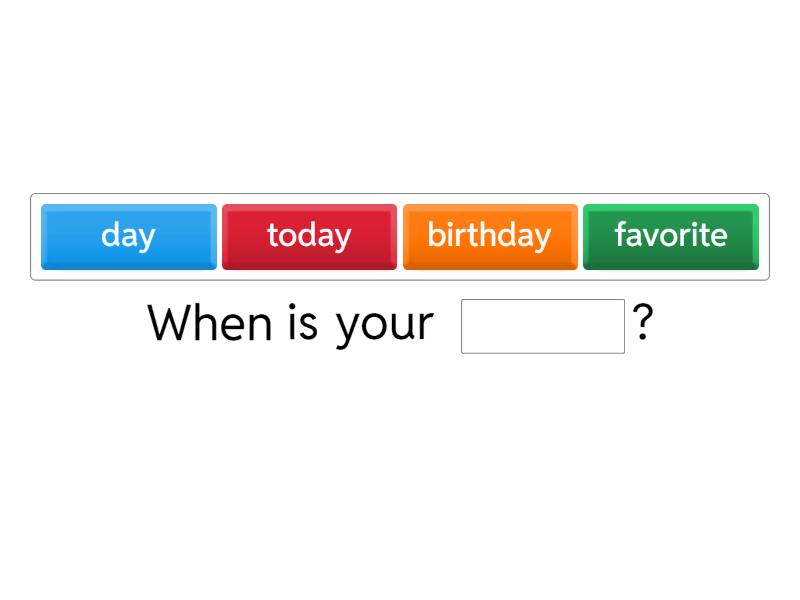 When is your ____? ____ is your last name? What is your ____ color? What is ____ favorite day? How ____ you? What day is ____? ____ is December fifth. Today is ____.
