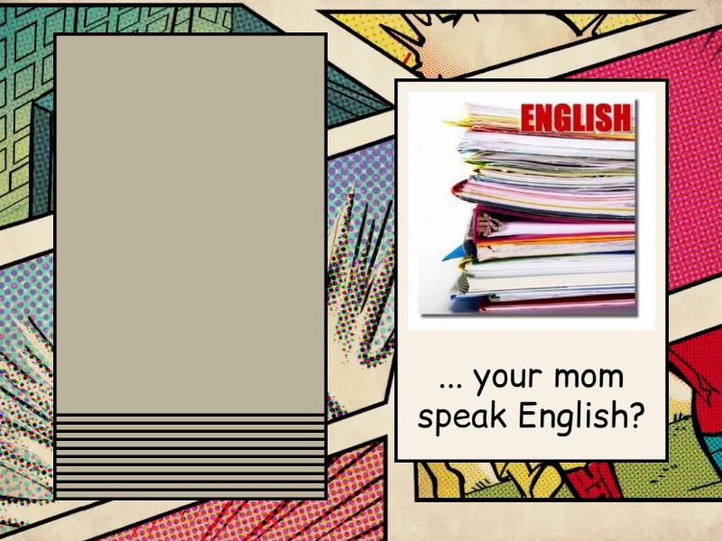 ... your mom like cooking?, ... you like painting?, ... your classmates like to play football?, ... you play any musical instrument?, ... your mom speak English?, ... you go to bed late?, ... your grandpa work at home?, ... you like your English teacher?, ... your sister do any sport?, ... you speak French?, ... your mom bake cakes?, ... your friends have pets?.