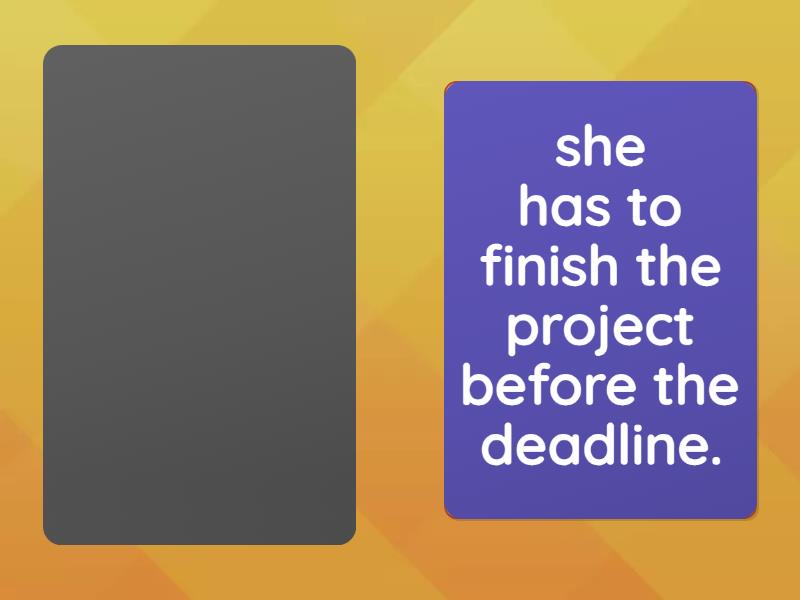 You don't have to wear uniforms., You must watch this show!, You mustn't open your seatbelt while driving!, You have to be panctual everyday for school., You don't really have to go to school today., We mustn't park here..., she has to finish the project before the deadline., Oh God! I have to go!.