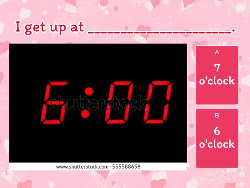 1) I get up at ______________________. a) 7 o'clock b) 6 o'clock 2) I get dressed at ______________________. a) 5 o'clock b) 7 o'clock 3) I have breakfast at ______________________. a) 6 o'clock b) 7 o'clock 4) I have lunch at ______________________. a) 2 o'clock b) 7 o'clock 5) I do my homework at ______________________. a) 2 o'clock b) 4 o'clock 6) I have dinner at ______________________. a) 6 o'clock b) 4 o'clock 7) I have a bath at ______________________. a) 7 o'clock b) 4 o'clock 8) I get to bed at ______________________. a) 6 o'clock b) 8 o'clock