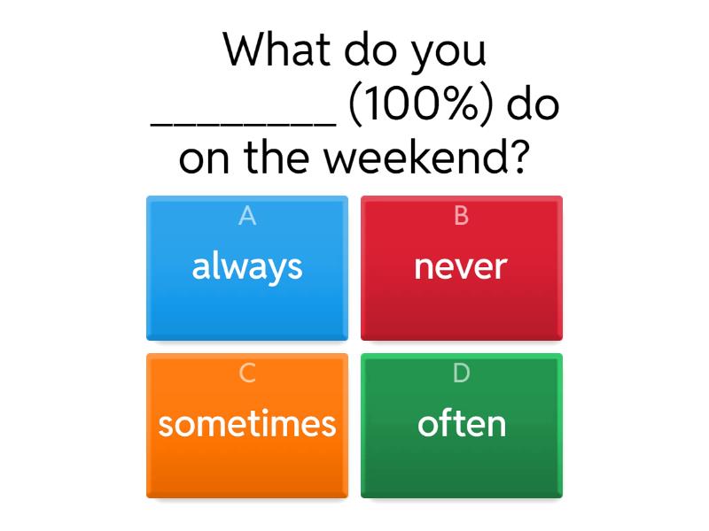 1) What do you ________ (100%) do on the weekend? a) always b) never c) sometimes d) often 2) I _________ 100% take shower. a) never b) always c) sometimes d) often 3) I ___________ (25%) listen to music. a) always b) often c) sometimes d) never 4) I _______ 0% swim in the sea a) always b) sometimes c) often d) never 5) I _________ (100%) cook spaghetti. a) always b) sometimes c) often d) never 6) I _________ (75%) play football. a) usually b) sometimes c) never d) always 7) I _________ (50%) ride my bike. a) often b) sometimes c) always d) never 8) I ________ (100%) wake up early. a) always b) sometimes c) never d) often 9) They _____ (25%) go to the supermarket. a) never b) sometimes c) always d) seldom 10) Tim ____ (50%) listens to music in the evenings. a) always b) sometimes c) never d) often