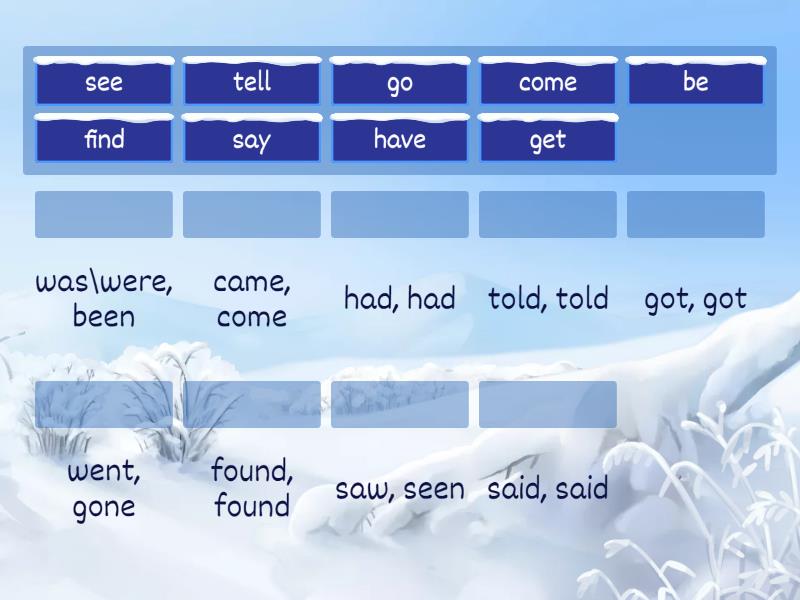 have - had, had, say - said, said, tell - told, told, get - got, got, find - found, found, come - came, come, see - saw, seen, be - was\were, been, go - went, gone,
