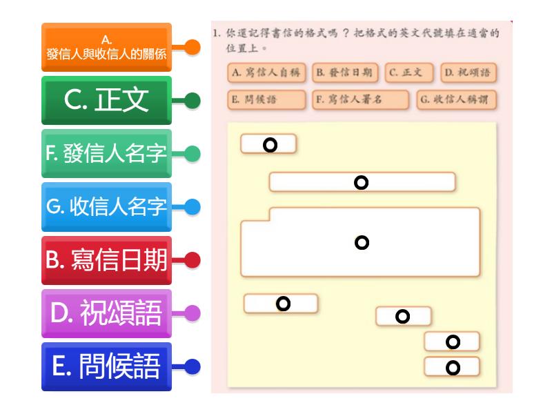G. 收信人名字, B. 寫信日期, A. 發信人與收信人的關係, C. 正文, D. 祝頌語, E. 問候語, F. 發信人名字.