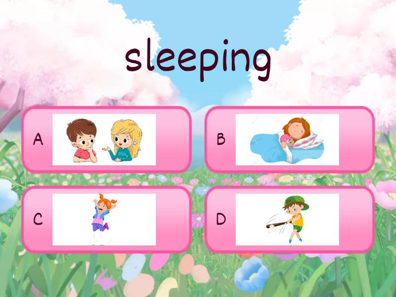 1) throwing a) b) c) d) 2) kicking a) b) c) d) 3) hitting a) b) c) d) 4) catching a) b) c) d) 5) getting a) b) c) d) 6) cleaning a) b) c) d) 7) sleeping a) b) c) d) 8) running a) b) c) d) 9) sitting a) b) c) d) 10) jumping a) b) c) d) 11) talking a) b) c) d) 12) flying a) b) c) d) 13) eating a) b) c) d)