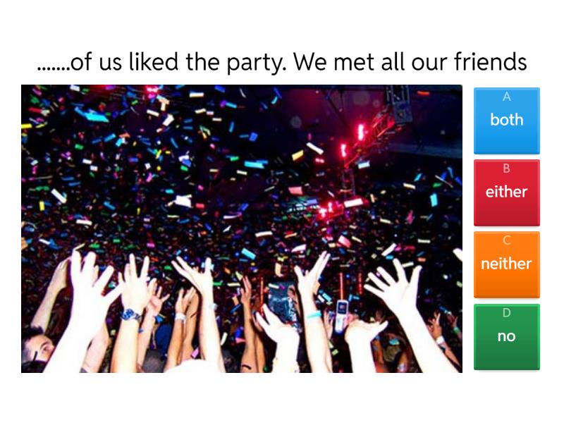 1) .......of us liked the party. We met all our friends a) both b) either c) neither d) no 2) .....Leila..... Amy passed the exam. They were .....upset. a) both...and b) either...or c) neither...nor d) neither ... and 3) You can take ____ the 38 bus or the 341 to get to town. a) both b) either c) neither d) none 4) When shall I call you, morning or afternoon? ........., I’ll be in all day. a) both b) either c) neither d) any 5) Where’s Kate? Is she at work or at home? ......... She's away on holiday. a) both b) either c) neither d) none 6) I tried to call George twice, but ......times he was out. a) both b) either c) neither d) all 7) .......Tom's parents is English. His father is Polish and his mother is Italian. a) both of b) either c) neither d) neither of 8) I tried two bookshops for the book I wanted but........ them had it. a) both b) either of c) neither of d) none 9) There were two windows in the room. It was very warm, so I opened them...... a) both b) either c) neither d) all 10) I was invited to two parties last week but I didn't go to ......of them a) both b) either c) neither d) any 11) Can you speak ... foreign language? Yes, I can speak both Spanish ... English. a) both, and b) either, or c) neither, any d) any, and 12) ... my cousin and my uncle went to the movie yesterday. a) both b) either c) neither d) none e) all 13) ... I nor my friend have tried Chinese food before. a) both b) neither c) either d) none 14) I have been to ...... of our local restaurants. a) both b) either c) neither d) all 15) Are you from Spain or from Italy? .... . I'm from Portugal. a) both b) either c) neither 16) The tennis game was fantastic. ...... players were great. a) both b) either c) neither