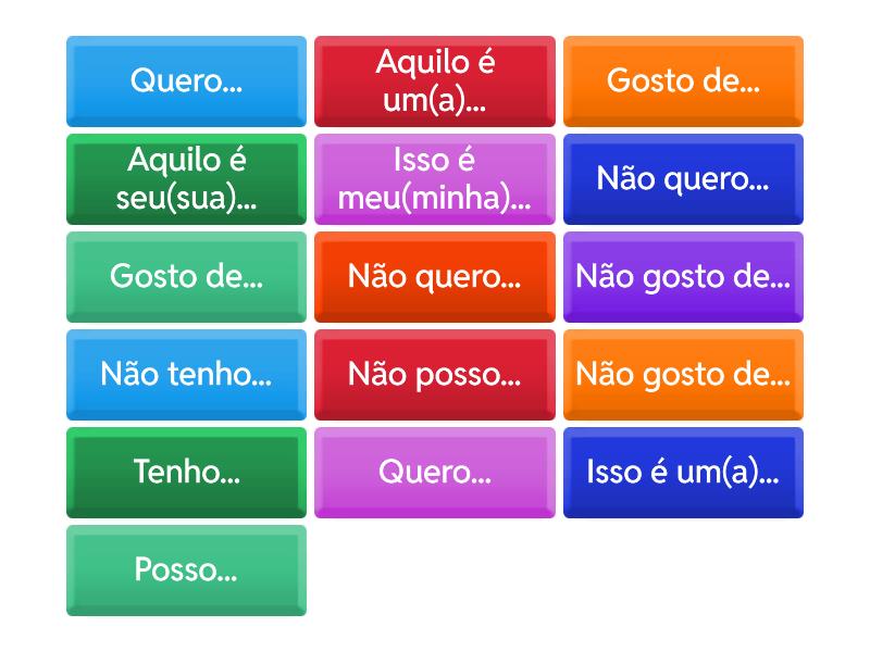 Gosto de... - I like..., Não gosto de... - I don't like..., Quero... - I want..., Não quero... - I don't want..., Posso... - I can..., Não posso... - I can't..., Tenho... - I have..., Não tenho... - I don't have..., Isso é um(a)... - This is a..., Aquilo é um(a)... - That is a..., Isso é meu(minha)... - This is my..., Aquilo é seu(sua)... - That is your..., Gosto de... - I like to..., Não gosto de... - I don't like to..., Quero... - I want to..., Não quero... - I don't want to...,