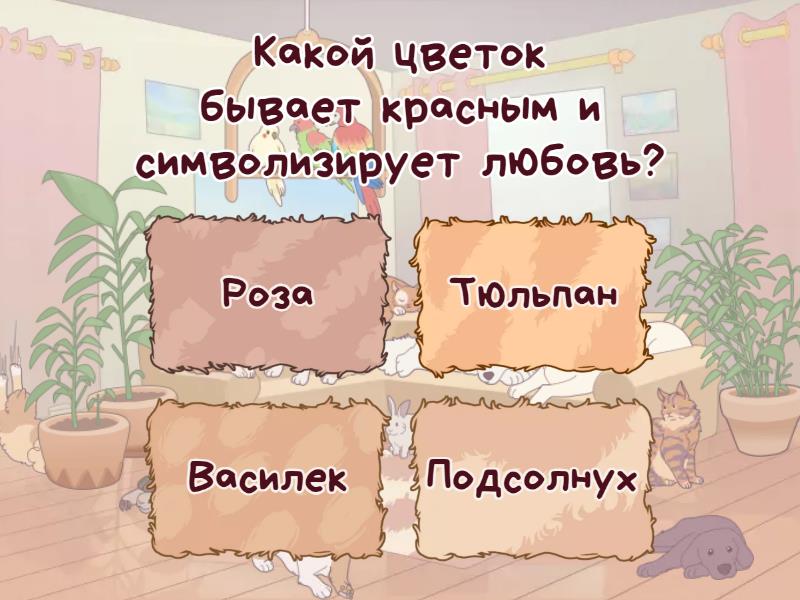1) Какой цветок бывает красным и символизирует любовь? a) Роза b) Тюльпан c) Василек d) Подсолнух 2) Какое из этих животных – млекопитающее? a) Дельфин b) Птица c) Ящерица d) Рыбы 3) Какое время года идет за летом? a) Зима b) Осень c) Весна 4) Какой организм выделяет кислород и очищает воздух? a) Дерево b) Собака c) Водоросли d) Бактерия 5) Какое из этих животных умеет летать? a) Собака b) Зяблик c) Кошка d) Кролик 6) Что из перечисленного является источником света? a) Луна b) Солнце c) Марс d) Млечный путь 7) Какой элемент представляет собой газ, который мы вдыхаем? a) Водород b) Углекислый газ c) Кислород d) Азот 8) Как называется животное, которое живет в воде и дышит жабрами? a) Кошка b) Собака c) Рыба d) Лошадь 9) Отметь дерево, семена которого птицы могут найти зимой a) Рябина b) Береза c) Дуб d) Клен 10) Какое из этих животных не делает запасов на зиму? a) Белка b) Мышь c) Заяц