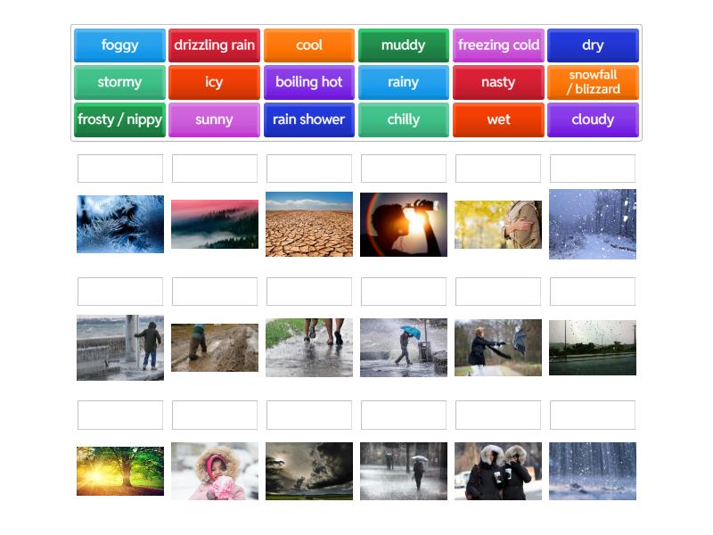 sunny, freezing cold, rainy, snowfall / blizzard, boiling hot, cloudy, stormy, icy, frosty / nippy, foggy, dry, wet, drizzling rain, chilly, cool, muddy, nasty, rain shower,