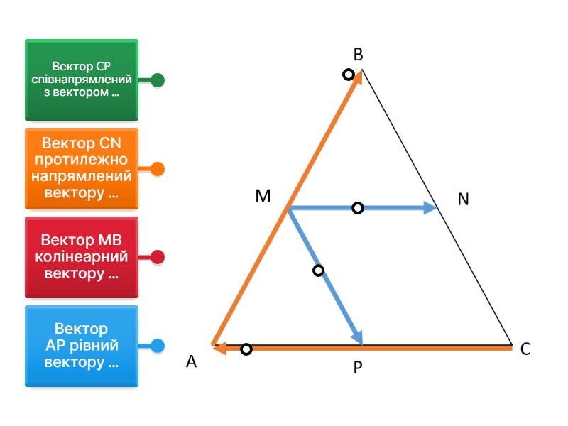 Вектор АР рівний вектору ..., Вектор МВ колінеарний вектору ..., Вектор СN протилежно напрямлений вектору ..., Вектор CP співнапрямлений з вектором ....