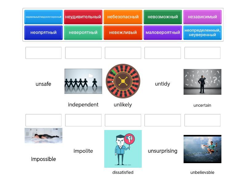неудивительный - unsurprising, незаконный - illegal, несправедливый - unfair, независимый - independent, нечестный - dishonest, неприемлемый - unacceptable, маловероятный - unlikely, невидимый - invisible, неопределенный, неуверенный - uncertain, нетерпеливый - impatient, безответственный - irresponsible, непреданный - disloyal, неопрятный - untidy, неправильный - incorrect, нечитаемый - illegible, невежливый - impolite, небезопасный - unsafe, недовольный/неудовлетворенный - dissatisfied, невероятный - unbelievable, невозможный - impossible,