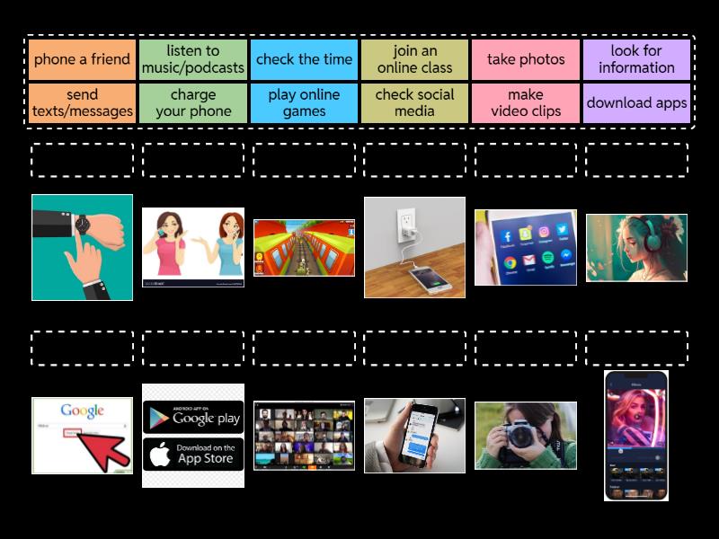 charge your phone, look for information, make video clips, phone a friend, play online games, send texts/messages, take photos, check social media, check the time, download apps, join an online class, listen to music/podcasts,