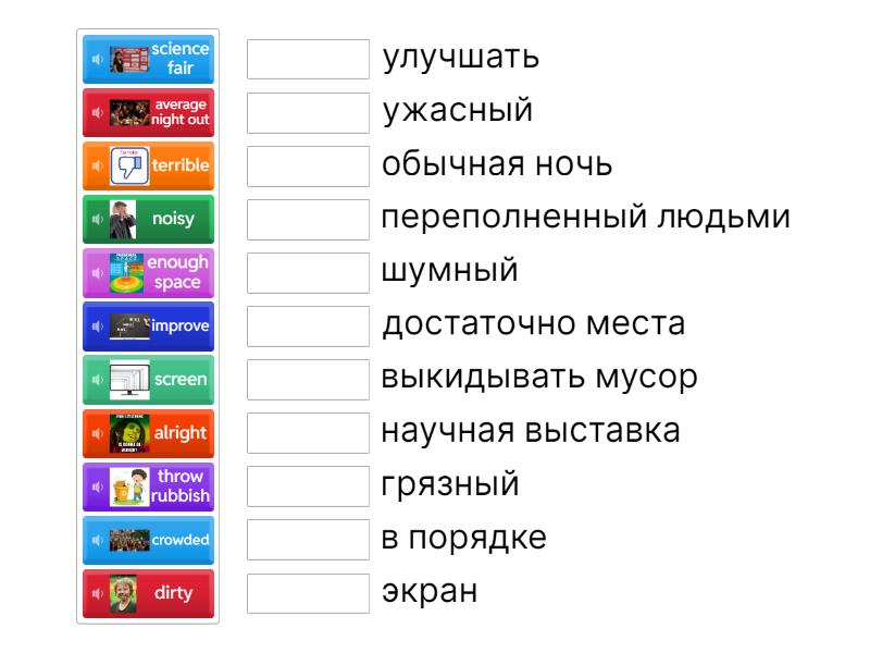 crowded - переполненный людьми, alright - в порядке, noisy - шумный, dirty - грязный, throw rubbish - выкидывать мусор, screen - экран, enough space - достаточно места, improve - улучшать, average night out - обычная ночь, terrible - ужасный, science fair - научная выставка,