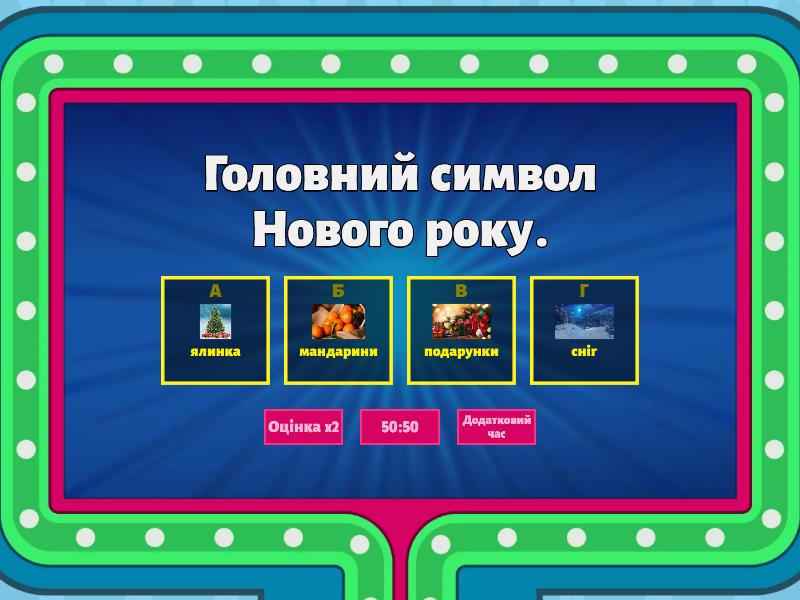 1) Головний символ Нового року. a) ялинка b) мандарини c) подарунки d) сніг 2) Різдвяні пісні, які особливо полюбляють діти. a) щедрівки b) колядки c) колискові d) веселі 3) Відгадай загадку. Влітку коні спочивають, взимку діточок катають. Коні ці не просять їжі. Хто ж вони? Звичайно… a) сани b) машина c) олені d) лижі 4) Уламки чого зробили героїв однієї зимової казки злими й безсердечними? a) Уламки скла b) Уламки дзеркала c) Уламки льоду 5) Американський Санта Клаус потрапляє до будинку через a) двері b) димохід c) вікно d) горище 6) Білі мухи — це… a) сніжинки b) комарі c) метелики d) град 7) Як звали хлопчика, якого рідні залишили на різдвяні свята одного вдома? a) Іван b) Кевін c) Стюард d) Стів 8) Природне явище, яке без пісочного посипання викликає у людей новорічне падіння. a) Ожеледиця b) Снігопад c) Хуртовина d) Вітер 9) Не буває двох однакових сніжинок. a) Правда b) Міф 10) В якій країні Санта відомий під ім’ям Йоулупуккі? a) У Норвегії. b) У Фінляндії. c) У Грузії.