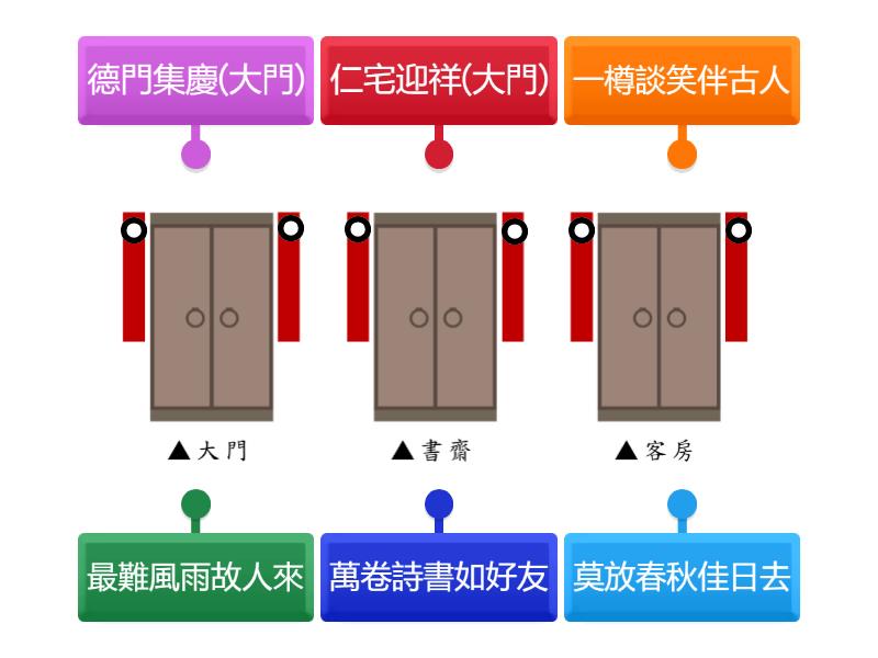 莫放春秋佳日去, 仁宅迎祥(大門), 一樽談笑伴古人, 最難風雨故人來, 德門集慶(大門), 萬卷詩書如好友.
