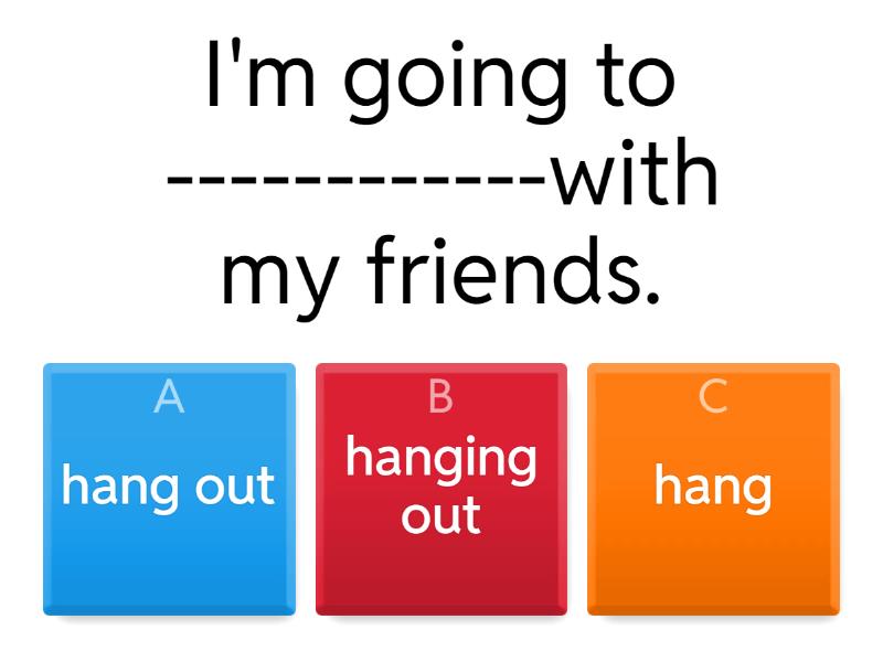 1) I'm going to ------------with my friends. a) hang out b) hanging out c) hang 2) I------- to London last year. a) travel b) traveled c) will travel 3) He is going to---------- a book about psychology. a) write b) wrote c) writing 4) She-------------to go to the movies tonight. a) go b) going to c) is going to 5) Yesterday, we---------some gifts from this store. a) buy b) are going to buy c) bought 6) They------------ play tennis. a) are going to b) is going to c) going to