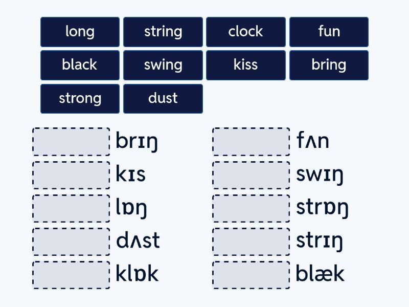 back - bæk, ring - rɪŋ, run - rʌn, black - blæk, king - kɪŋ, kiss - kɪs, block - blɒk, bring - brɪŋ, bus - bʌs, brick - brɪk, string - strɪŋ, cut - kʌt, clock - klɒk, long - lɒŋ, spell - spɛl, click - klɪk, strong - strɒŋ, camp - kæmp, sing - sɪŋ, hunt - hʌnt, duck - dʌk, song - sɒŋ, can - kæn, gong - ɡɒŋ, fun - fʌn, lock - lɒk, swing - swɪŋ, wet - wɛt, twig - twɪɡ, dust - dʌst,