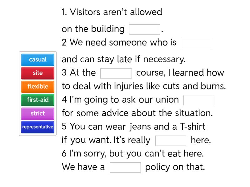 1. Visitors aren’t allowed on the building ____. 2 We need someone who is ____ and can stay late if necessary. 3 At the ____ course, I learned how to deal with injuries like cuts and burns. 4 I’m going to ask our union ____ for some advice about the situation. 5 You can wear jeans and a T-shirt if you want. It’s really ____ here. 6 I’m sorry, but you can’t eat here. We have a ____ policy on that. 1. When you want to take time ____ for a holiday, please fill out the online form. 2. You’ll hear an alarm soon. Don’t worry, it’s just a practice ____ drill. 3. I’m working the night ____ I start at 10 p.m. 4. We have to wear ____ clothes when we meet with clients. 5. I’m thinking of becoming a ____ member to support better working conditions. 6. One of our most important health and ____ rules is to always wash your hands.