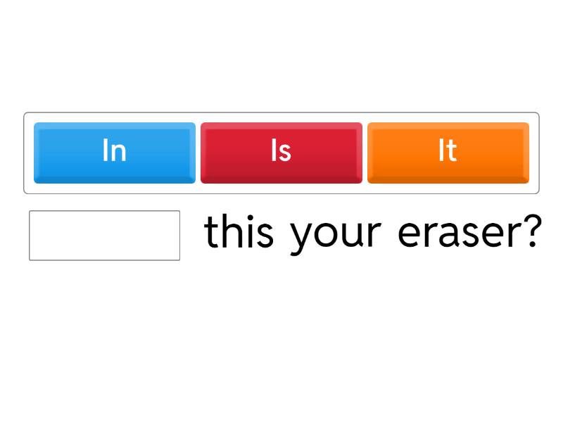 ____ this your eraser? Yes, it ____. No, ____ isn't. Is this ____ pencil? It's not ____ eraser. Give ____ a hand, please. What ____ is it? It's sunny in ____. It's ten ____. The eraser is ____ the chair. Sorry I'm ____, Mom. It's sunny ____ hot. ____ up, please. Is ____ your pencil? Is this ____ pencil case? Watch ____ Be careful!