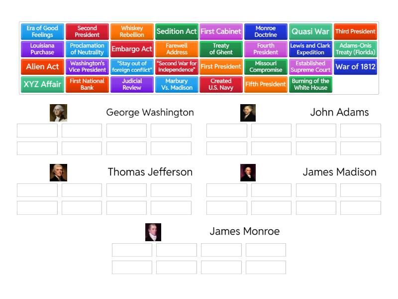 George Washington: Farewell Address, Whiskey Rebellion, First President, Proclamation of Neutrality, "Stay out of foreign conflict", First Cabinet, First National Bank, Established Supreme Court, John Adams: Second President, Alien Act, Sedition Act, XYZ Affair, Washington's Vice President, Quasi War, Created U.S. Navy, Thomas Jefferson: Louisiana Purchase, Embargo Act, Marbury Vs. Madison, Third President, Judicial Review, Lewis and Clark Expedition, James Madison: War of 1812, Treaty of Ghent, Burning of the White House, "Second War for Independence", Fourth President, James Monroe: Monroe Doctrine, Fifth President, Era of Good Feelings, Missouri Compromise, Adams-Onis Treaty (Florida),