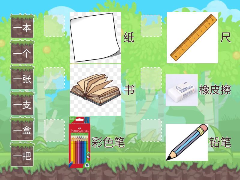 一个 - 橡皮擦, 一张 - 纸, 一支 - 铅笔, 一本 - 书, 一把 - 尺, 一盒 - 彩色笔,