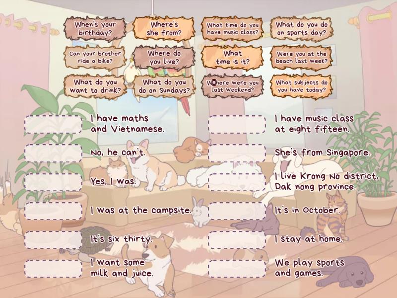 What time is it? - It’s six thirty., What time do you have music class? - I have music class at eight fifteen., When’s your birthday? - It’s in October., What do you do on Sundays? - I stay at home., What subjects do you have today? - I have maths and Vietnamese., What do you do on sports day? - We play sports and games., Where’s she from? - She’s from Singapore., Can your brother ride a bike? - No, he can’t., What do you want to drink? - I want some milk and juice., Were you at the beach last week? - Yes, I was., Where were you last weekend? - I was at the campsite., Where do you live? - I live Krong No district, Dak nong province. ,
