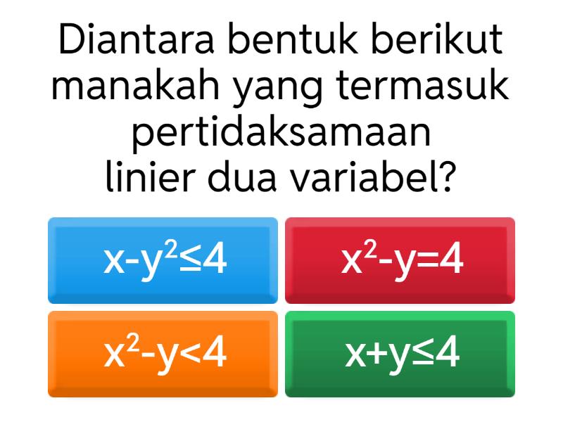 1) Diantara bentuk berikut manakah yang termasuk pertidaksamaan linier dua variabel? a) x-y2≤4 b) x2-y=4 c) x2-y<4 d) x+y≤4 2) Jika daerah yang diarsir adalah suatu daerah himpunan penyelesaian. maka daerah himpunan penyelesaian dari y≥3x+6 adalah… a) b) c) d) 3) Himpunan penyelesaian pertidaksamaan 2x+y≥4 dapat dinyatakan dengan … a) b) c) d) 4) Seorang pedagang paling sedikit menyewa 28 kendaraan untuk jenis truk dan colt, dengan jumlah yang diangkut sebanyak 272 karung. Truk dapat mengangkut tidak lebih dari 14 karung dan colt 8 karung. Ongkos sewa truk Rp500.000,00 dan colt Rp300.000,00. Jika x menyatakan banyaknya truk dan y menyatakan banyaknya colt, maka model matematika dari permasalahan di atas adalah… a) x+y≤28; 7x+4y≤136 ;x≥0; y≥0 b) x+y≥28; 7x+4y≤136; x≥0; y≥0 c) x+y≤28; 7x+4y≥136; x≥0; y≥0 d) x+y≤28; 7x+4y≤136; x≥0; y≥0 5) Anis akan membeli mangga dan apel. Jumlah buah yang dibeli paling sedikit 12 buah. Mangga yang dibeli paling banyak 6 buah. Harga mangga Rp2.000,00 per buah dan apel Rp4.000,00 per buah. Ia mempunyai uang Rp20.000,00. Jika ia membeli x mangga dan y apel, maka sistem pertidaksamaan yang sesuai adalah a) x+2y≥10; x+y≥12; x≥6 b) x+2y≤10; x+y≥12; x≤6 c) x+2y≤10; x+y≤12; x≥6 d) x+2y≤10; x+y≥12; x≥6