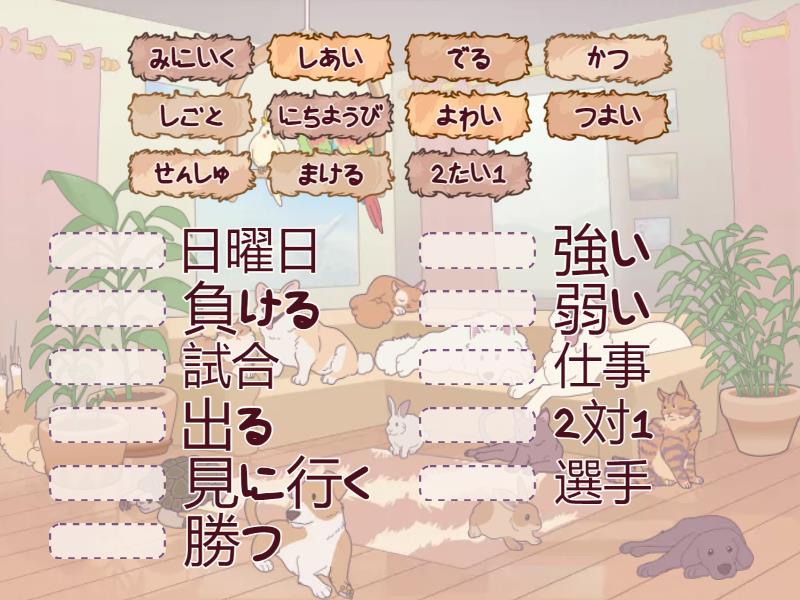しあい - 試合, せんしゅ - 選手, よわい - 弱い, みにいく - 見に行く, まける - 負ける, つよい - 強い, 2たい1 - 2対1, にちようび - 日曜日, かつ - 勝つ, でる - 出る, しごと - 仕事,