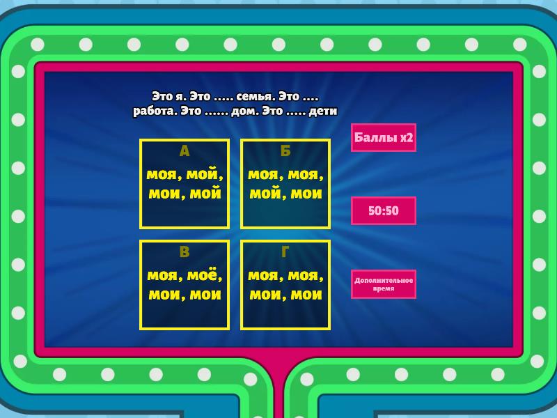 1) Это я. Это ..... семья. Это .... работа. Это ...... дом. Это ..... дети a) моя, мой, мои, мой b) моя, моя, мой, мои c) моя, моё, мои, мои d) моя, моя, мои, мои 2) Это ты. Это ..... машина. Это .... вино. Это ...... стулья. Это ..... телефон. a) твоя, твой, твоё, твой b) твоя, твоя, твои, твой c) твоя, твоё, твои, твой d) твоя, твоё, твоя, твой 3) Это мы. Это ... улица. Это .... город. Это ...... кафе. Это ..... фирма. a) наш, наша, наше, наши b) наш, наша, наше, наша c) наша, наш, наше, наша d) наш, наша, наши, наша 4) Это вы. Это .... газеты. Это ...... пиво. Это ..... работа. Это .... деньги. a) ваш, ваша, ваши, ваши b) ваши, ваше, ваша, ваши c) ваши, ваша, ваши, ваши d) ваш, ваша, ваши, ваш 5) Это Эмреджан. Это .... работа, .... машина, ..... деньги, .... время. a) его его его его b) её её её её c) ево ево ево ево d) ёе ёе ёе ёе 6) Это Катя. Это .... работа, .... машина, ..... деньги, .... время. a) его его его его b) её её её её c) ево ево ево ево d) ёе ёе ёе ёе 7) Это Эмреджан и Каан. Это ... дом. Это .... работа. Это ... дети. a) их их их b) оних оних оних c) икх икх икх d) они они они 8) Я живу в Мурманске. Это .... комната. Мой друг тоже живёт в Мурманске. ... комната находится здесь. Мы работаем вместе. ..... завод называется "Крондекс". Мои друзья работают в Турции. Но мне не нравится .... работа. a) мой, его, наш, их b) моя, его, наша, их c) моя, его, наш, их d) моя, его, наш, её