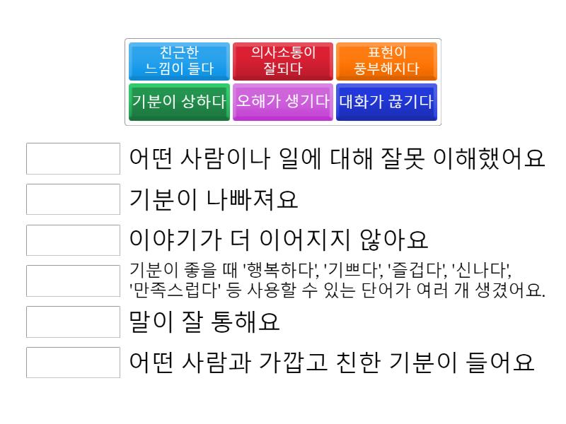 친근한 느낌이 들다 - 어떤 사람과 가깝고 친한 기분이 들어요, 의사소통이 잘되다 - 말이 잘 통해요, 표현이 풍부해지다 - 기분이 좋을 때 '행복하다', '기쁘다', '즐겁다', '신나다', '만족스럽다' 등 사용할 수 있는 단어가 여러 개 생겼어요. , 대화가 끊기다 - 이야기가 더 이어지지 않아요, 오해가 생기다 - 어떤 사람이나 일에 대해 잘못 이해했어요, 기분이 상하다 - 기분이 나빠져요,