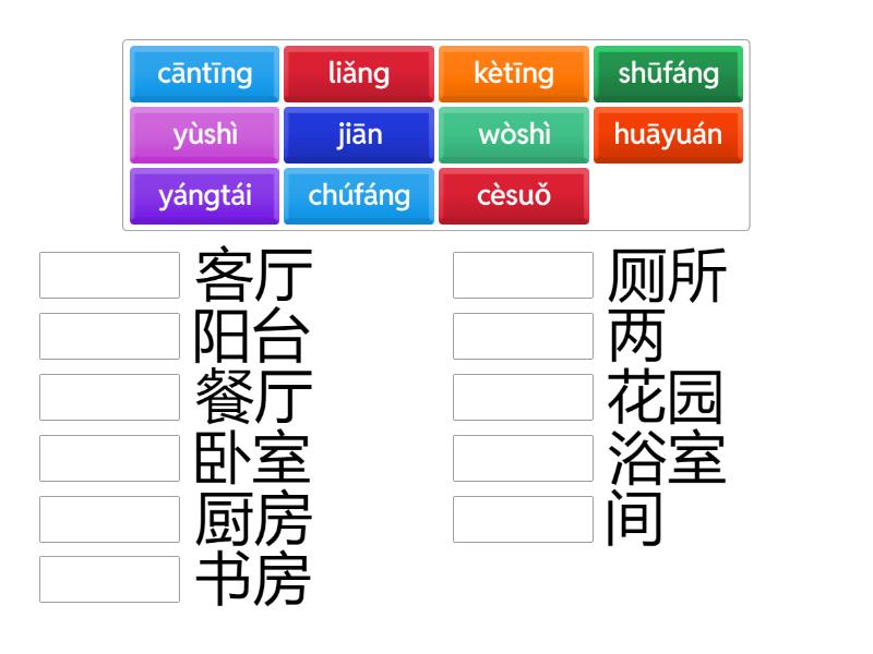 liǎng - 两, jiān - 间, wòshì - 卧室, kètīng - 客厅, yùshì - 浴室, chúfáng - 厨房, shūfáng - 书房, cāntīng - 餐厅, cèsuǒ - 厕所, yángtái - 阳台, huāyuán - 花园,
