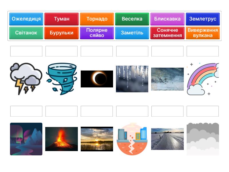 Веселка, Туман, Землетрус, Полярне сяйво, Блискавка, Торнадо, Заметіль, Ожеледиця, Бурульки, Сонячне затемнення, Виверження вулкана, Світанок,