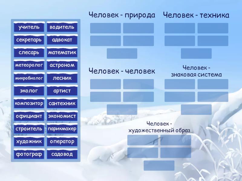 Человек - природа: садовод, эколог, метеоролог, микробиолог, лесник, Человек - техника: слесарь, сантехник, строитель, водитель, Человек - человек: секретарь, учитель, официант, парикмахер, адвокат, Человек - знаковая система: математик, оператор, астроном, экономист, Человек - художественный образ: фотограф, композитор, артист, художник,