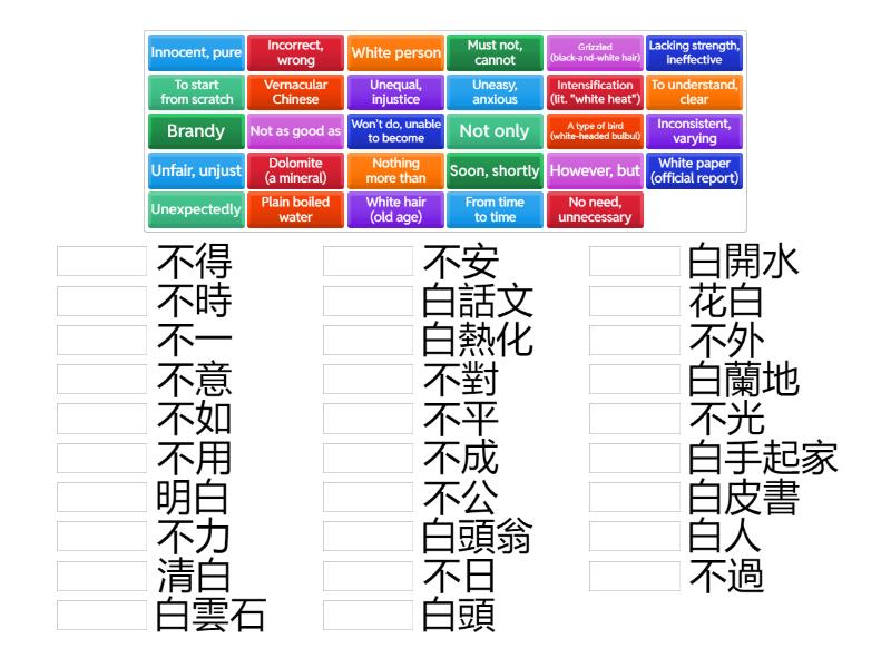 White hair (old age) - 白頭, White person - 白人, Grizzled (black-and-white hair) - 花白, To understand, clear - 明白, Innocent, pure - 清白, Vernacular Chinese - 白話文, Plain boiled water - 白開水, Brandy - 白蘭地, White paper (official report) - 白皮書, Intensification (lit. "white heat") - 白熱化, A type of bird (white-headed bulbul) - 白頭翁, Dolomite (a mineral) - 白雲石, To start from scratch - 白手起家, Uneasy, anxious - 不安, Won’t do, unable to become - 不成, Must not, cannot - 不得, Incorrect, wrong - 不對, Unfair, unjust - 不公, Not only - 不光, However, but - 不過, Lacking strength, ineffective - 不力, Unequal, injustice - 不平, Soon, shortly - 不日, Not as good as - 不如, From time to time - 不時, Nothing more than - 不外, Inconsistent, varying - 不一, Unexpectedly - 不意, No need, unnecessary - 不用,