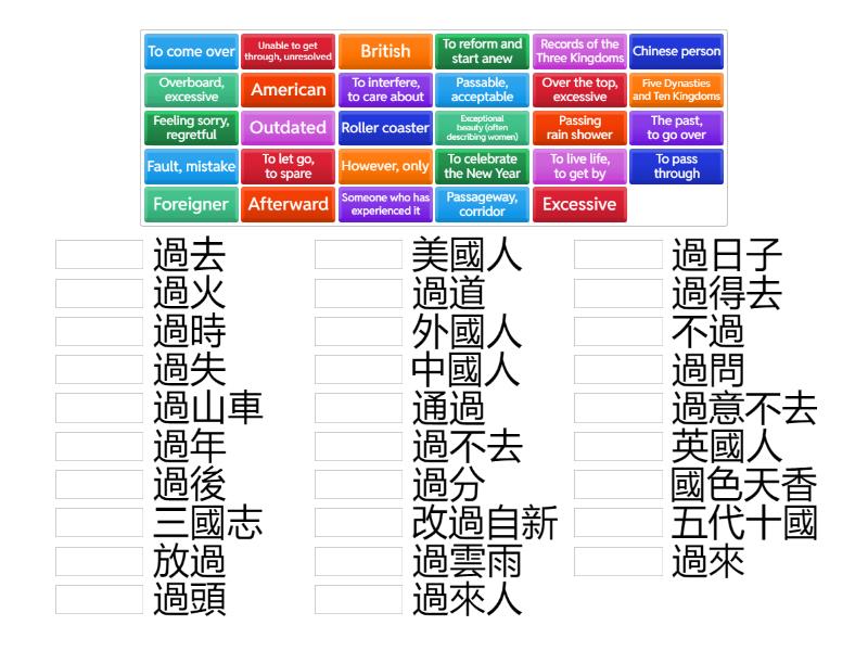 Chinese person - 中國人, Foreigner - 外國人, American - 美國人, British - 英國人, Records of the Three Kingdoms - 三國志, Five Dynasties and Ten Kingdoms - 五代十國, Exceptional beauty (often describing women) - 國色天香, Passageway, corridor - 過道, Excessive - 過分, Afterward - 過後, Overboard, excessive - 過火, To come over - 過來, To celebrate the New Year - 過年, The past, to go over - 過去, Fault, mistake - 過失, Outdated - 過時, Over the top, excessive - 過頭, To interfere, to care about - 過問, However, only - 不過, To let go, to spare - 放過, To pass through - 通過, Unable to get through, unresolved - 過不去, Passable, acceptable - 過得去, Someone who has experienced it - 過來人, To live life, to get by - 過日子, Roller coaster - 過山車, Passing rain shower - 過雲雨, Feeling sorry, regretful - 過意不去, To reform and start anew - 改過自新,